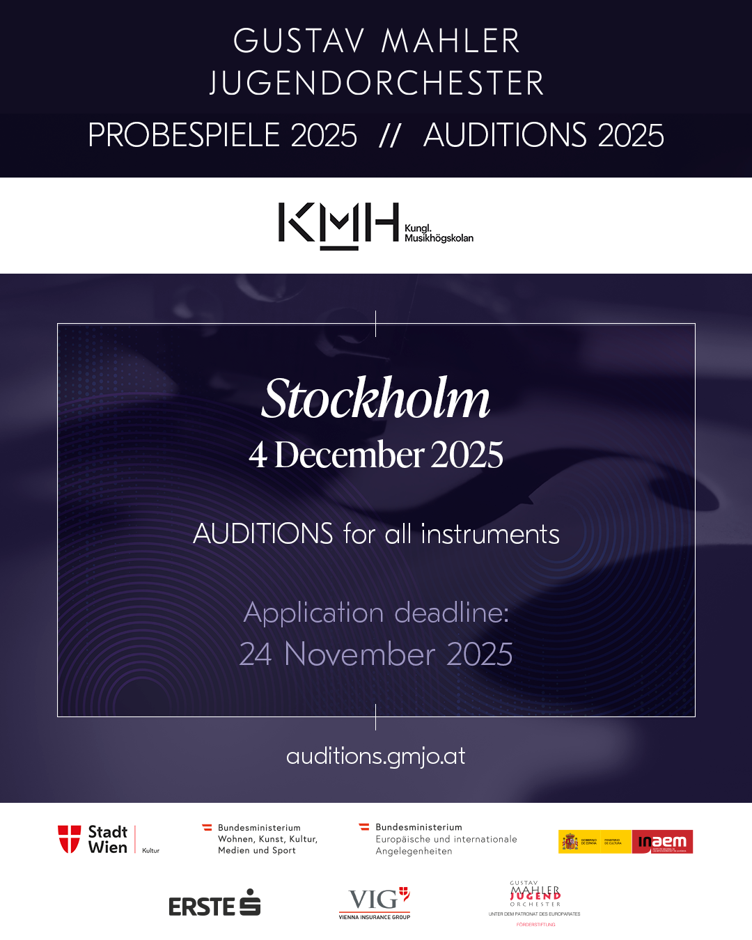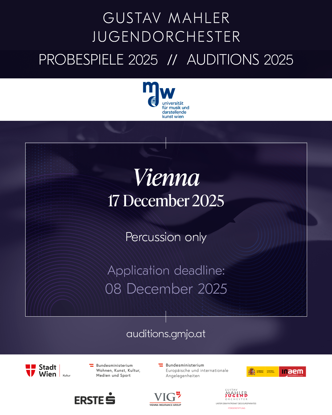 Hinweis: Musikerinnen und Musiker mit dauerhaftem Wohnsitz in der Ukraine, Belarus oder Russland, die nicht zu einem der angebotenen Probespielorte reisen können, bitten wir das GMJO Büro bis zum 1. Dezember 2025 zu kontaktieren.
